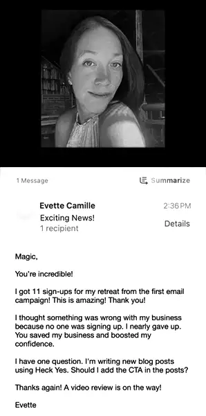 I got 11 sign-ups for my retreat from the first email campaign! This is amazing! Thank you!